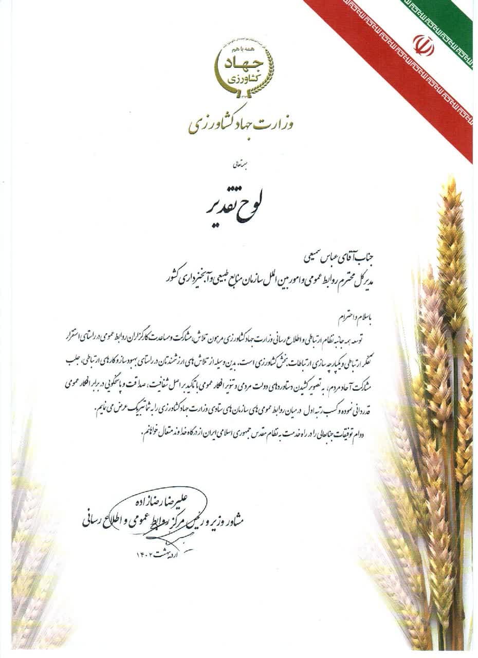 رتبه اول روابط عمومی سازمان منابعطبیعی و آبخیزداری کشور در وزارت جهاد کشاورزی