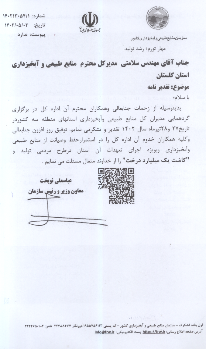 بدینوسیله از زحمات جنابعالی و همکاران محترم آن اداره کل در برگزاری گردهمایی مدیران کل منابع طبیعی و آبخیزداری استان های منطقه سه کشور در تاریخ 27 و 28 تیرماه سال 1402 تقدیر و تشکر می نمایم. توفیق روز افزون جنابعالی و کلیه همکاران خدوم آن اداره کل را در استمرار حفظ و صیانت از منابع طبیعی و آبخیزداری و به ویژه اجرای تعهدات آن استان در طرح مردمی تولید و کاشت یک میلیارد درخت را از خداوند متعال مسئلت می نمایم.