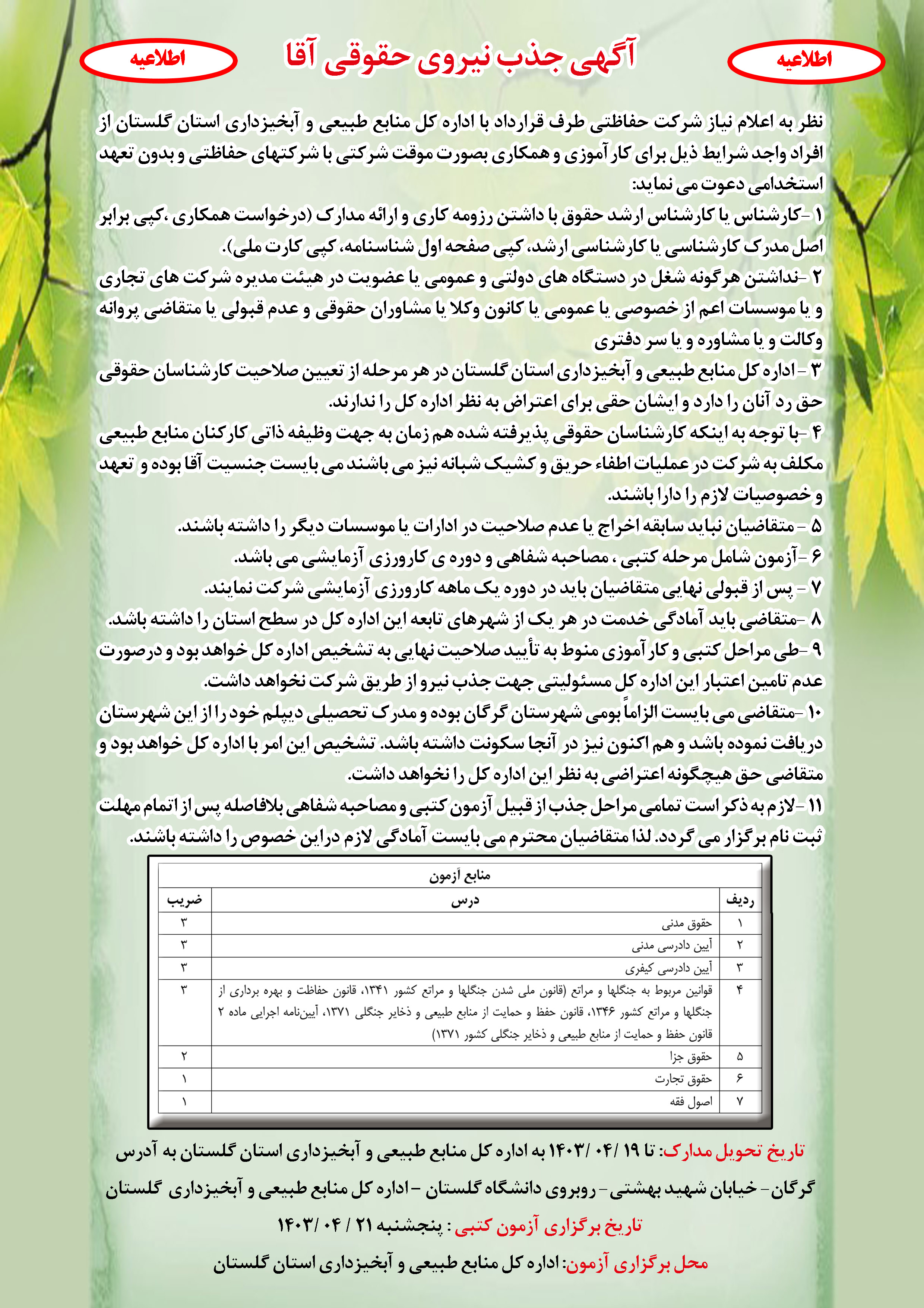 محل برگزاری آزمون: اداره کل منابع طبیعی و آبخیزداری استان گلستان