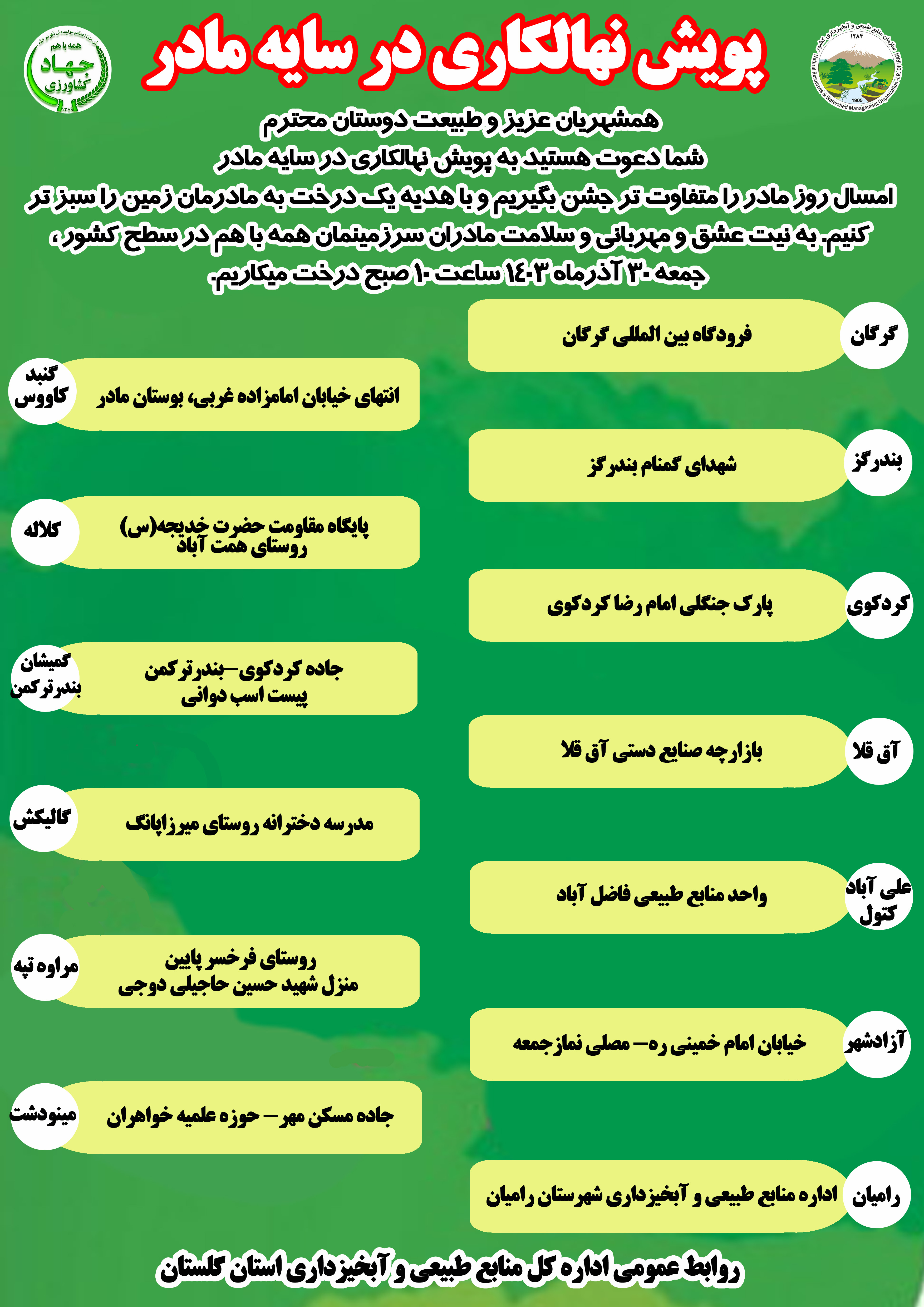 به گزارش پایگاه اطلاع رسانی اداره کل منابع طبیعی و آبخیزداری گلستان، پویش نهالکاری در سایه مادر در 18 نقطه استان گلستان و کاشت 2110 نهال برگزار می شود.